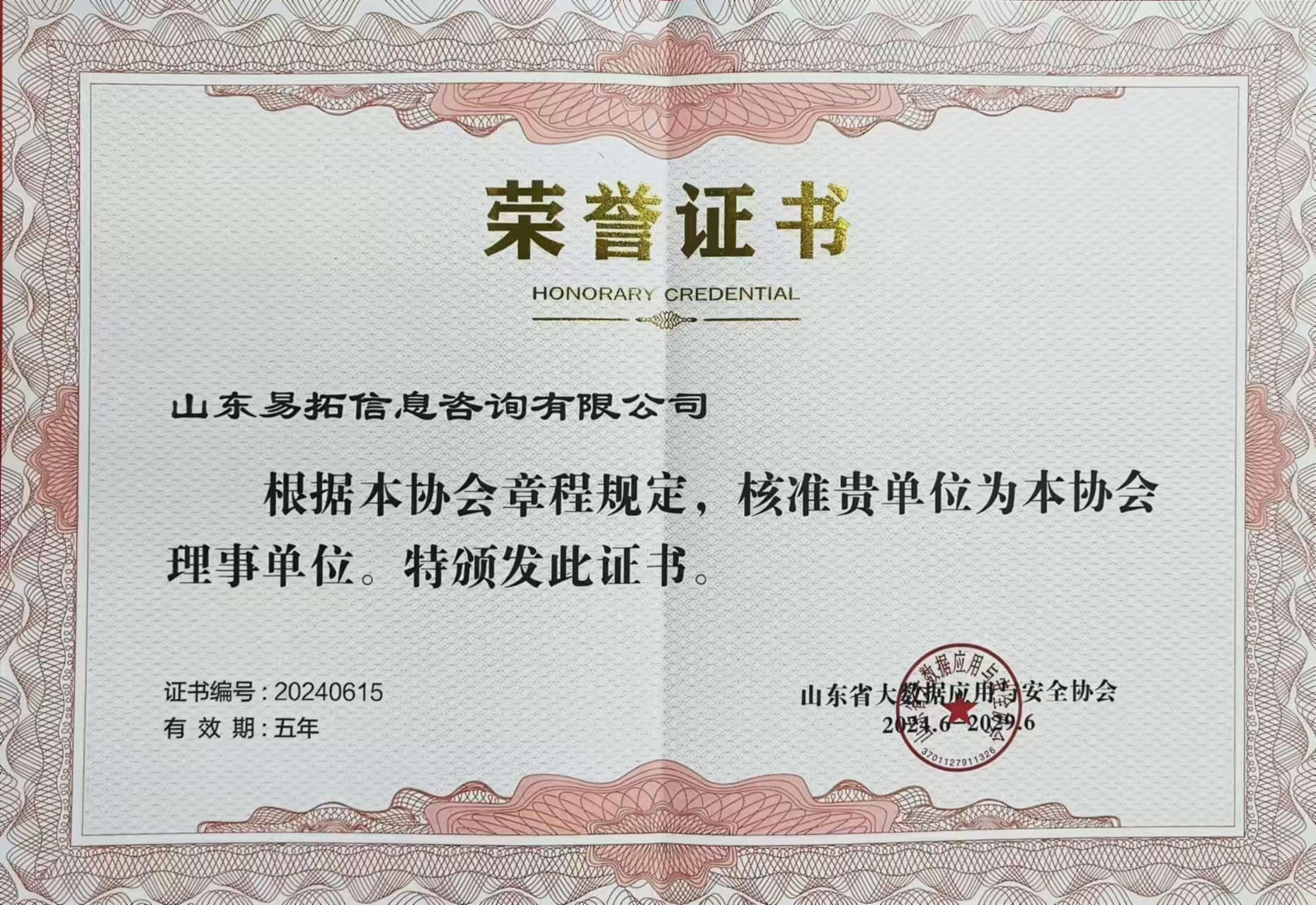 山东大数据应用与安全协会理事单位荣誉证书